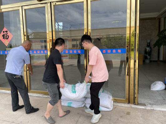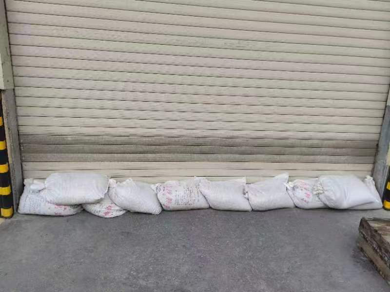 (圖為泉州鹽業(yè)配送中心倉庫準(zhǔn)備應(yīng)急防汛沙袋,對倉庫卷閘門進行防水防堵。)