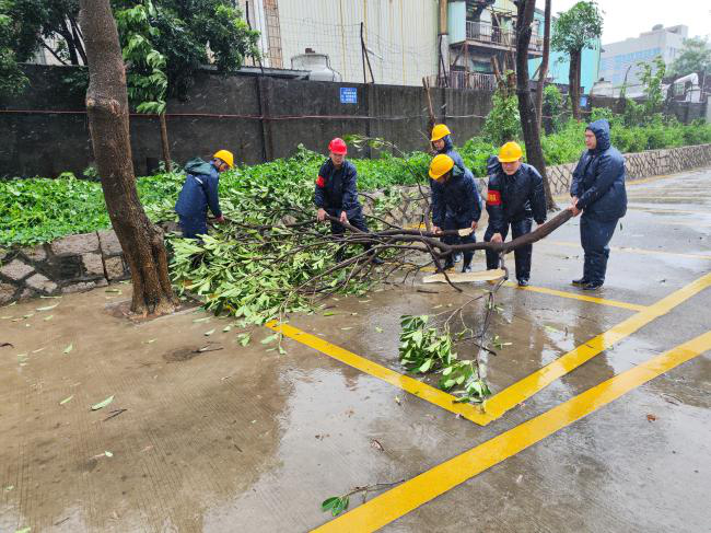 (圖為泉州融合黨員突擊隊排查風(fēng)險隱患,及時清理倒塌的樹枝)
