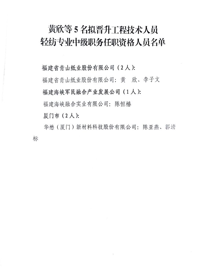 福建省工業(yè)控股集團(tuán)有限公司關(guān)于2024年度福建省工程技術(shù)人員輕紡專業(yè)中級(jí)職稱評(píng)審結(jié)果的公示