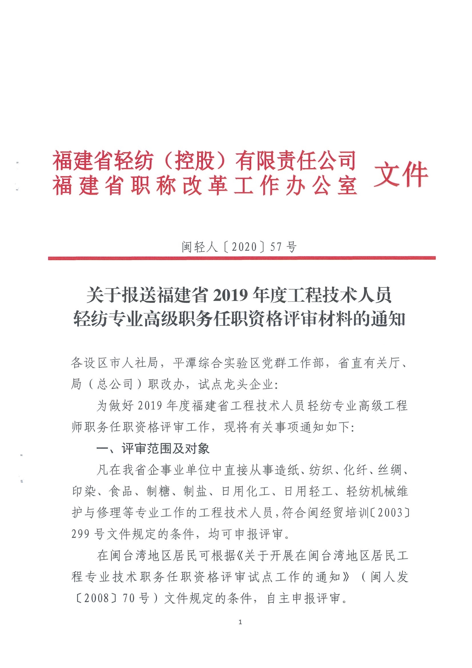 關(guān)于報送2019年度工程技術(shù)人員輕紡專業(yè)高級職務(wù)任職資格評審材料的通知