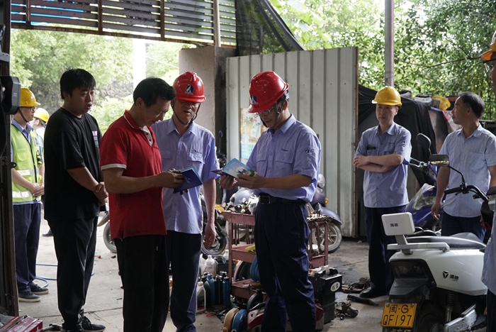圖注:青山紙業(yè)總經(jīng)理余宗遠(yuǎn)為電動(dòng)車維修點(diǎn)工作人員贈(zèng)送《防災(zāi)減災(zāi)宣傳冊(cè)》