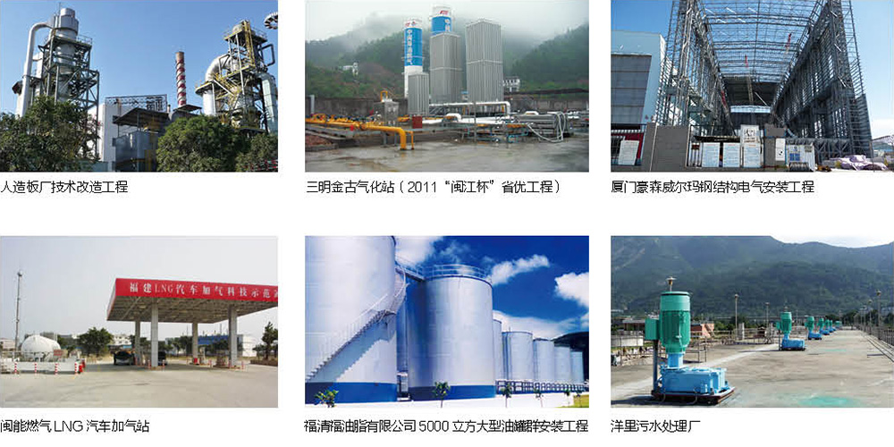 公司能夠承接重型工業(yè)、輕紡工業(yè)、石油化工、工業(yè)鍋爐熱電、電子信息工業(yè)、醫(yī)療制藥業(yè)、民用工程、消防工程、市政工程等大中型工程。承建有亞洲最大氯酸鹽產(chǎn)量,氯酸鉀規(guī)模世界第一的福州一化集團技改工程;亞洲第一的青山紙業(yè)皮紙脫墨生產(chǎn)線工程;福建省東南電化集團15萬噸/年產(chǎn)PVC技改工程;福州市中亭街址六萬平方暖通工程;馬尾船政海洋工程裝備及特種船舶項目陸域工程第一、二部分投資建設(shè)項目等。