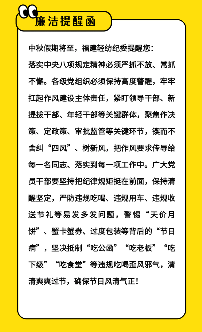 中秋廉潔提醒函——福建輕紡紀(jì)委