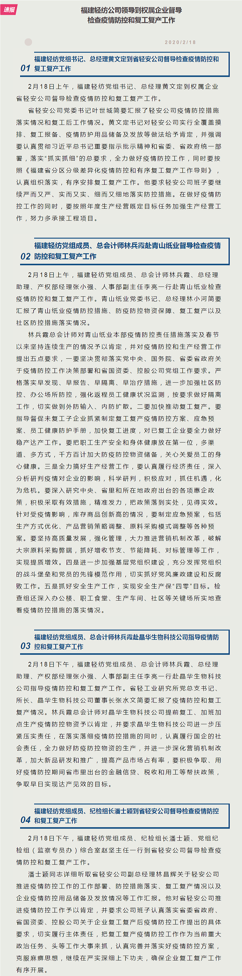 福建輕紡公司領(lǐng)導(dǎo)2月18日到權(quán)屬企業(yè)督導(dǎo)檢查疫情防控和復(fù)工復(fù)產(chǎn)工作