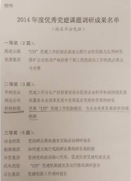 根據(jù)閩國資黨委〔2015〕56號文件通知,公司2014年度黨建調(diào)研課題《開展“