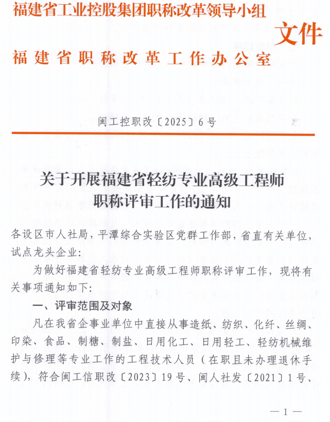 福建省工業(yè)控股集團職稱改革領導小組福建省職稱改革工作辦公室文件-關于開展福建省輕紡專業(yè)高級工程師職稱評審工作的通知.pdf