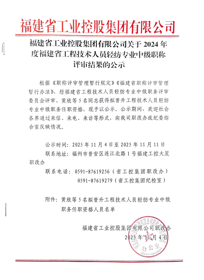 福建省工業(yè)控股集團(tuán)有限公司關(guān)于2024年度福建省工程技術(shù)人員輕紡專業(yè)中級(jí)職稱評(píng)審結(jié)果的公示